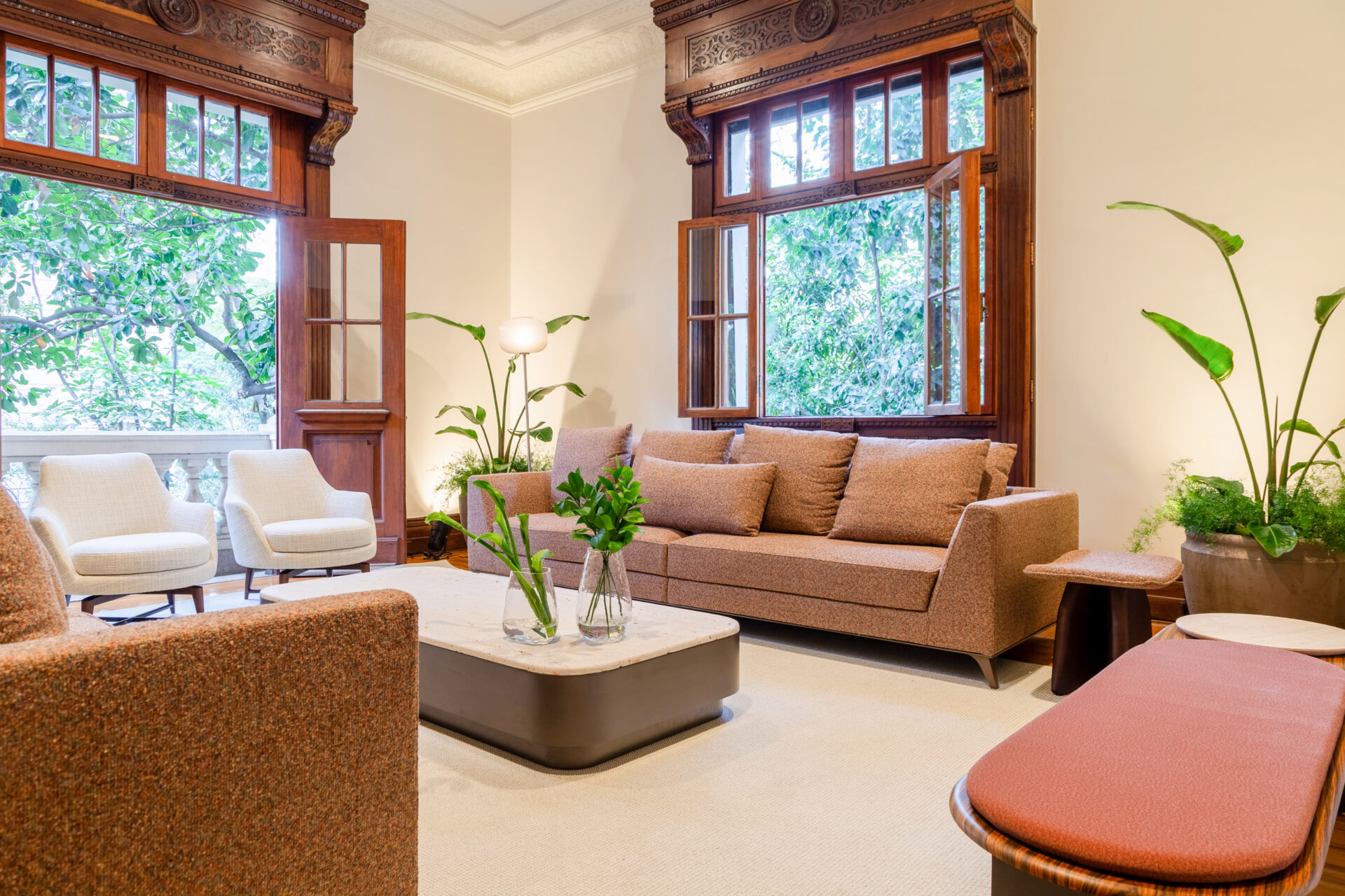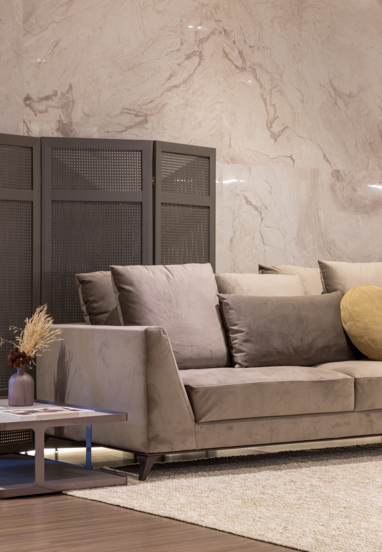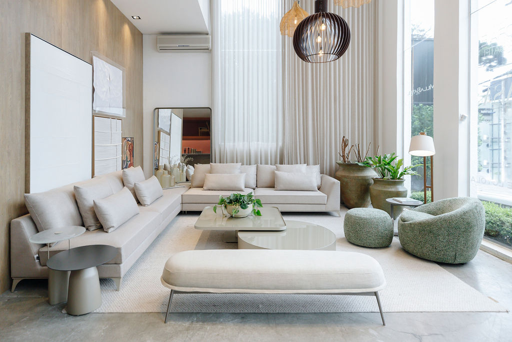 Dependendo da proposta do sofá, o tecido pode estar sempre retilíneo ou então mais disforme.